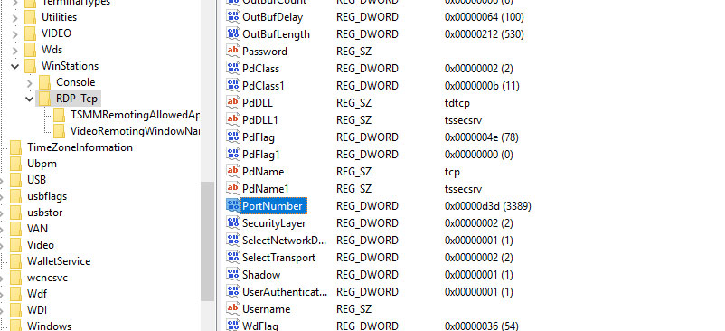 3-عدد 3389 موجود رو تغییر بدید به عدد دلخواه خودتون ، در انجا ممکن است که به جای 3389 بصورت d3d نمایش داده باشد. فقط توجه داشته باشید که با شماره پورت های دیگر تداخلی نداشته باشه ، ترجیحا Well Known Ports نباشد.