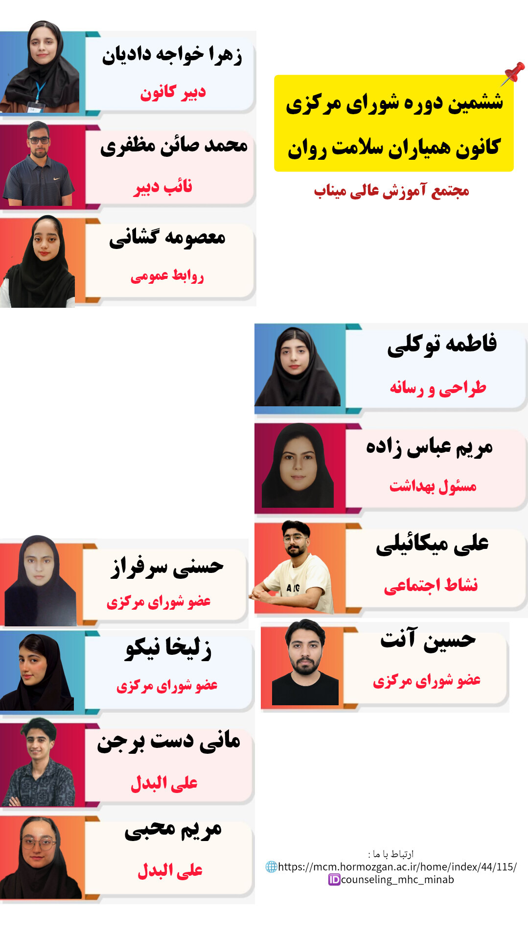 دانشجويان به عنوان اصحاب فكر و انديشه از سرمايههاي ناب هر جامعهای به شمار ميروند و نقش ارزنده و اهميت بي بديل آنها بر هيچكس پوشيده نيست. ششمین دوره شوراي مركزي كانون همياران اين مجتمع دانشگاهی که در هويتبخشي به فعاليتهاي داوطلبانه، آگاهی بخشی به فعالیت های مرکز مشاوره و سلامت ٬ به فعالیت میپردازند به حضور پر مهرتان معرفی میگردند. اميد است با وجود چنين دانشجويان مستعد و با انگيزه شاهد رشد و شكوفايى توانمنديهای هر چه بيشتر آنان و ايجاد یک محیط دانشگاهي با نشاط و پویا باشيم.